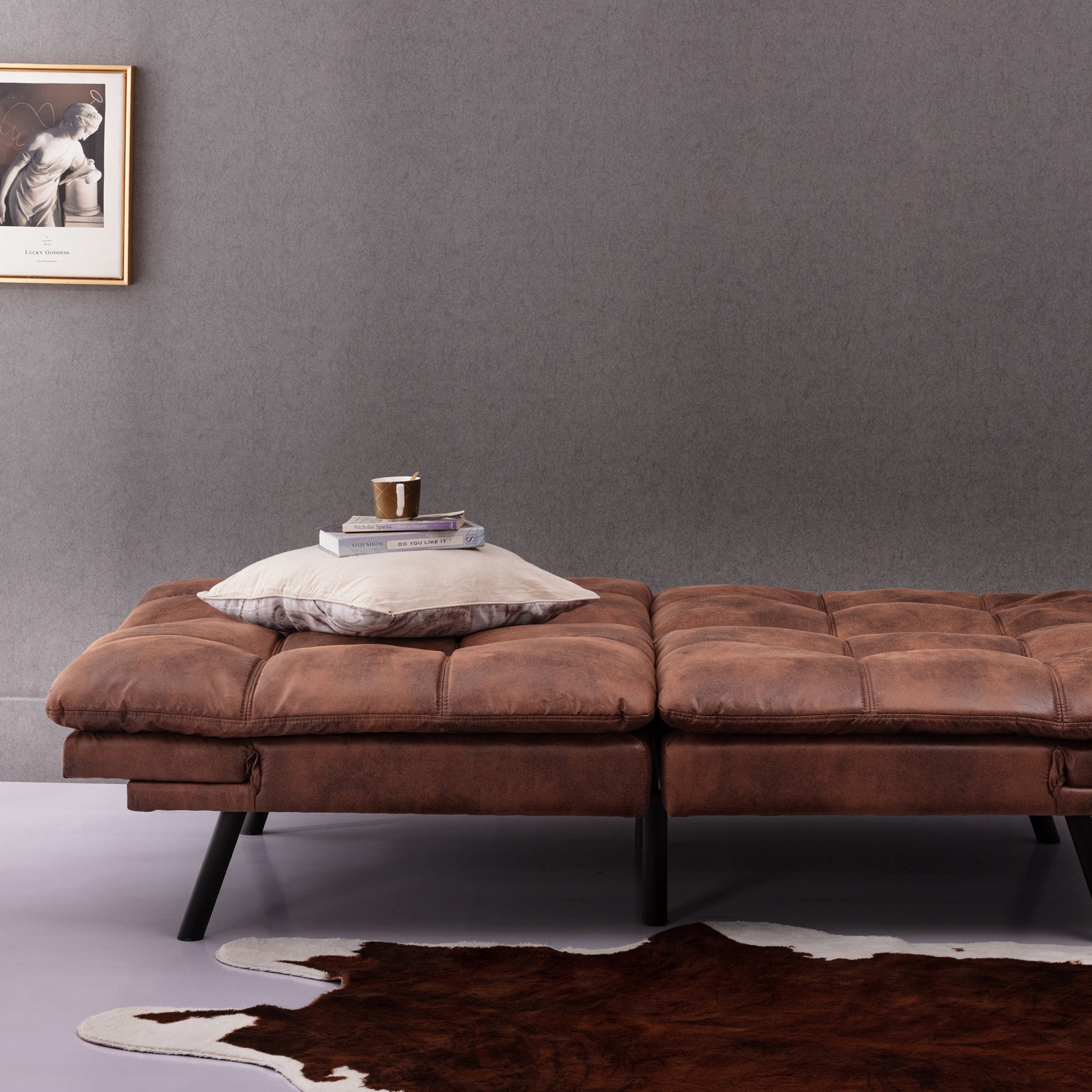 Feature[Covertible Futon Sofa Bed]One form of sofa can not satisfy everyone; we can convert the sofa into different forms by converting the armrests and backrests. Use it to watch TV or convert it into a bed for sleeping; which can not only help us save space; but also more economical.[Safety and comfort]In order to produce a soft and comfortable sofa; we increased the thickness of the memory foam inside the sofa to 3 inches; which means that when we convert the sofa into a bed; we don't need extra pillows or topper to get a deep sleep; the raw materials of the sofa are certified by CertiPUR-US without adding any harmful chemicals to protect you and your family's safety[Modern Loveseat]Modern design brown suede leather sofa can decorate compact living space with high end atmosphere. If you accidentally spill coffee; drink; tea or other stains on the sofa; you can easily scrub it clean with just a damp cloth or paper towel[Sofa bed in a box]When we open the box to take out the sofa; we can follow the assembly video or instructions to easily complete the assembly; if you have any questions; our colleagues in the United States can easily help you solveProduct Dimensions