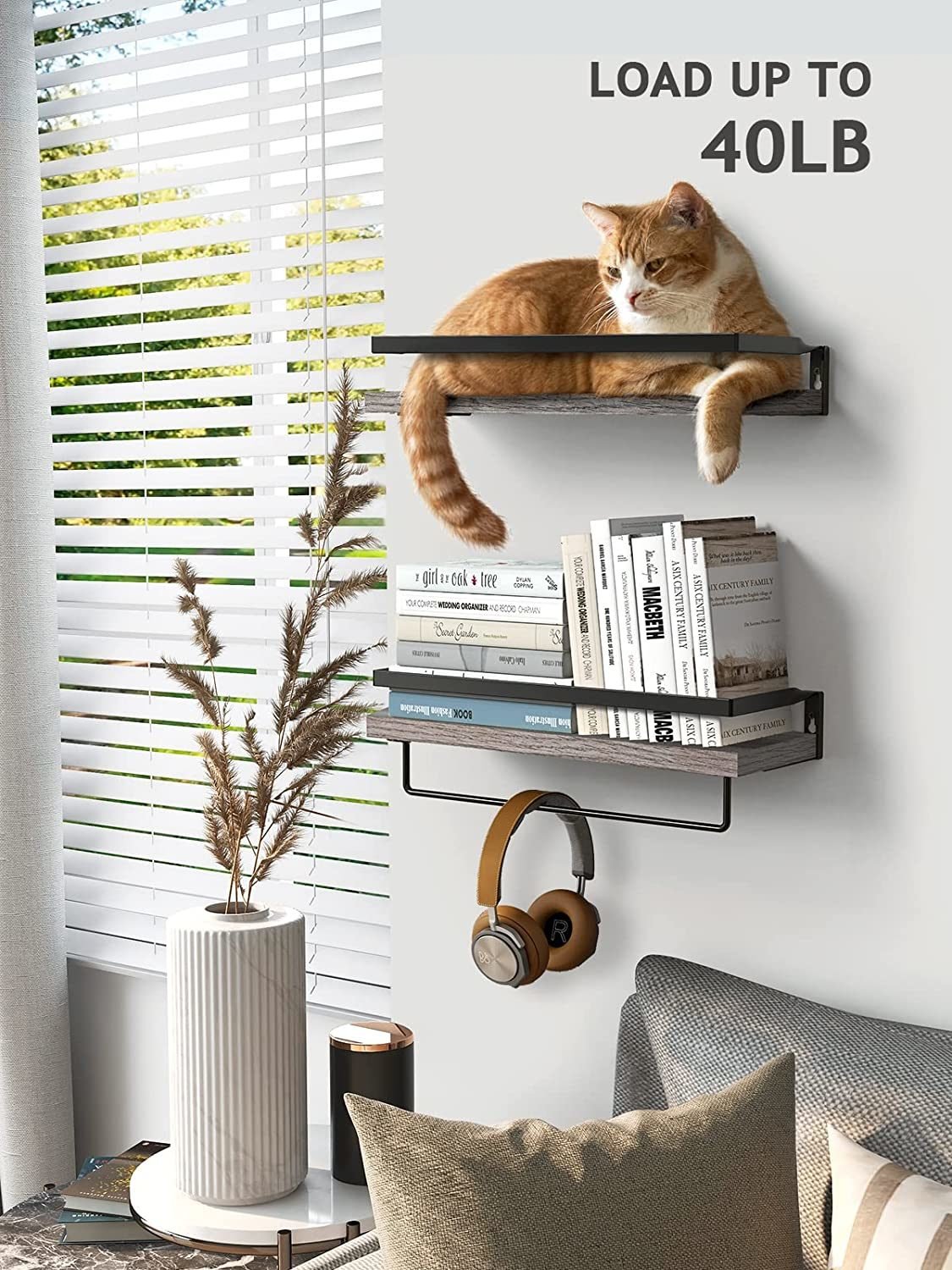 2.2. HIGH LOAD CAPACITY - Constructed with 0.59" thick Paulownia wood, powder-coated metal supports and a fire-fired finish, the floating shelves are durable enough to hold 40 lbs of items. Decorate and organize your home more beautifully and neatly.