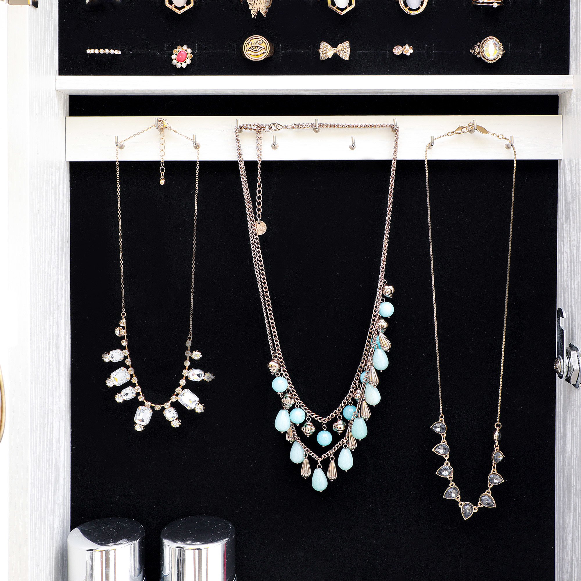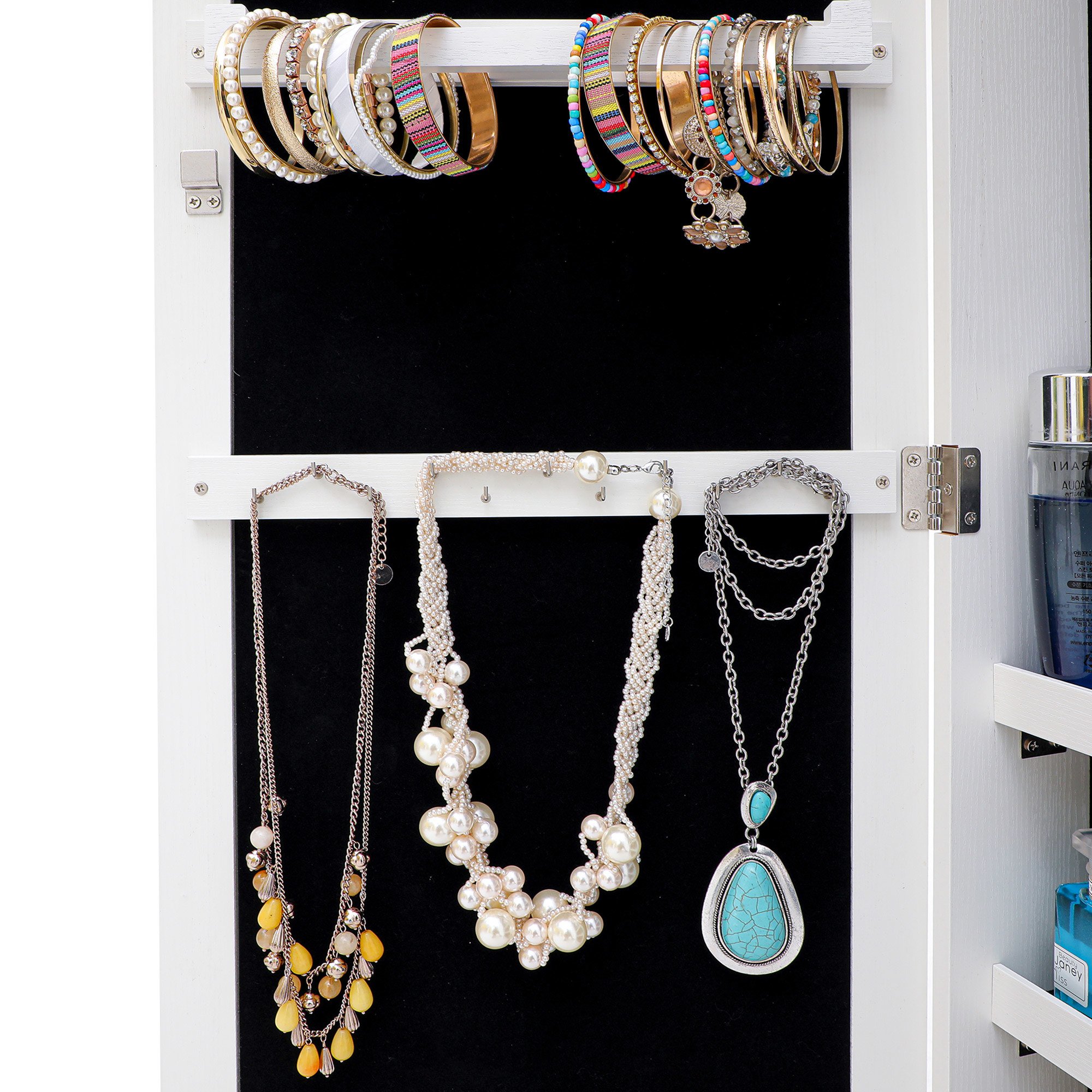You can mount the jewelry organizer on the wall with screws or hang it on the back of your door with hooks, also two adjustable height available.